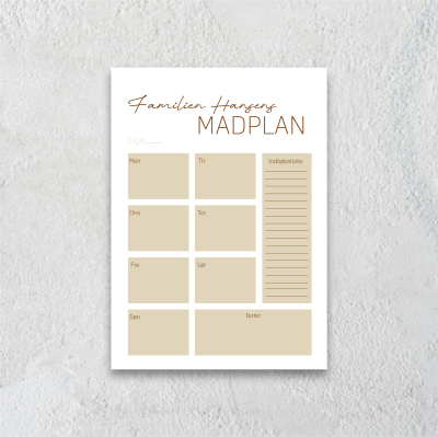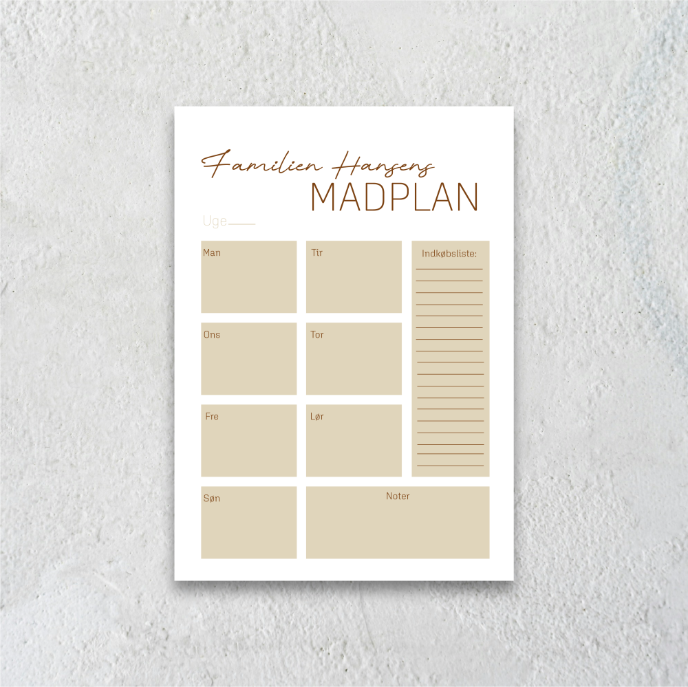 Du kan selv vælge farve, overskrift og navne, så madplanen bliver personlig og passer til netop jeres rytme og hverdag.