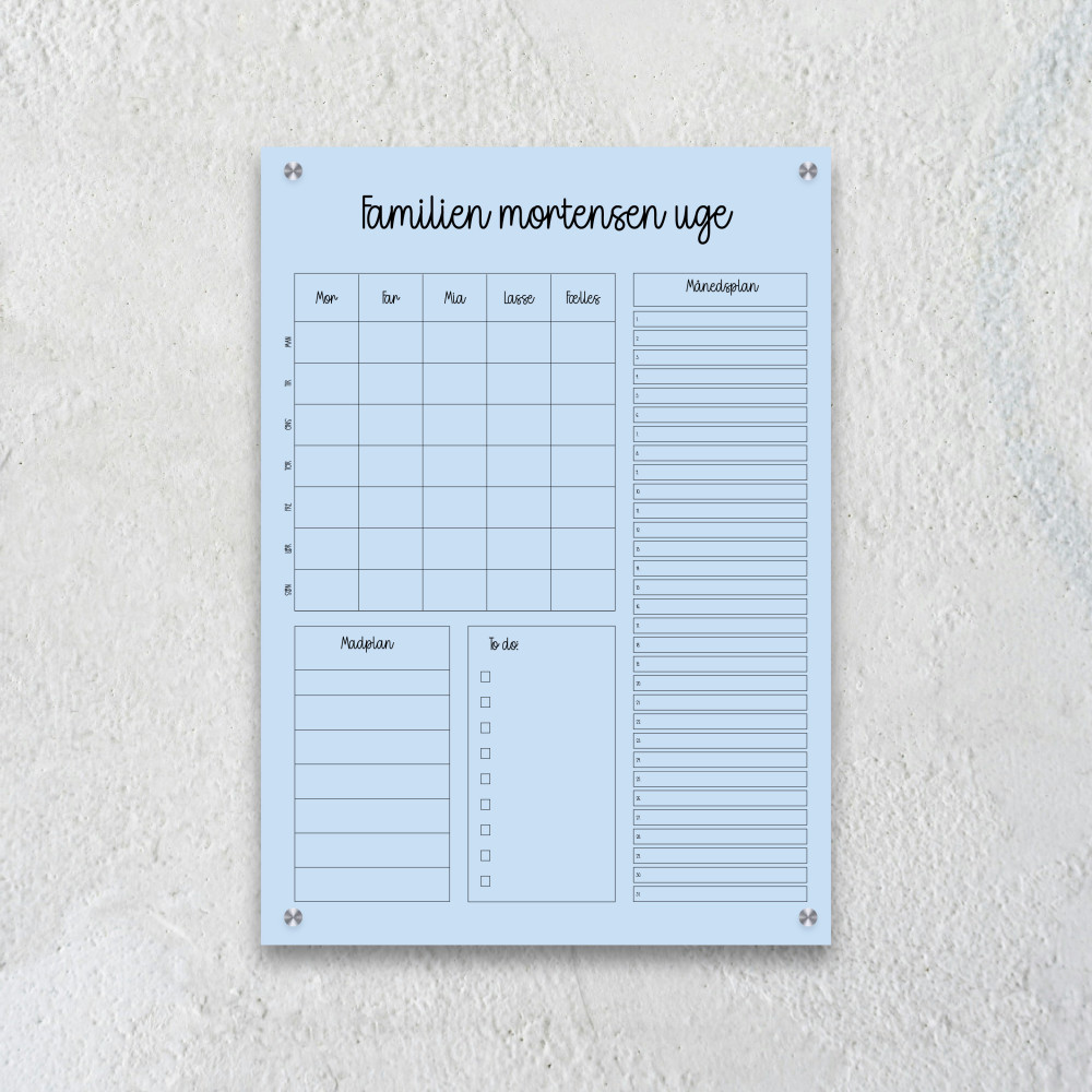 Du kan personliggøre planen ved at vælge farve, overskrift og navne, så den bliver skræddersyet til netop jeres hverdag og rutiner.