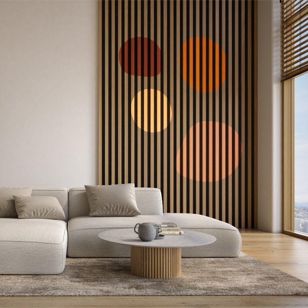 Vores akustikplader i træ fås i flere størrelser og designs, så du kan tilpasse udtrykket til alt fra stue og kontor til studie og mødelokale.
