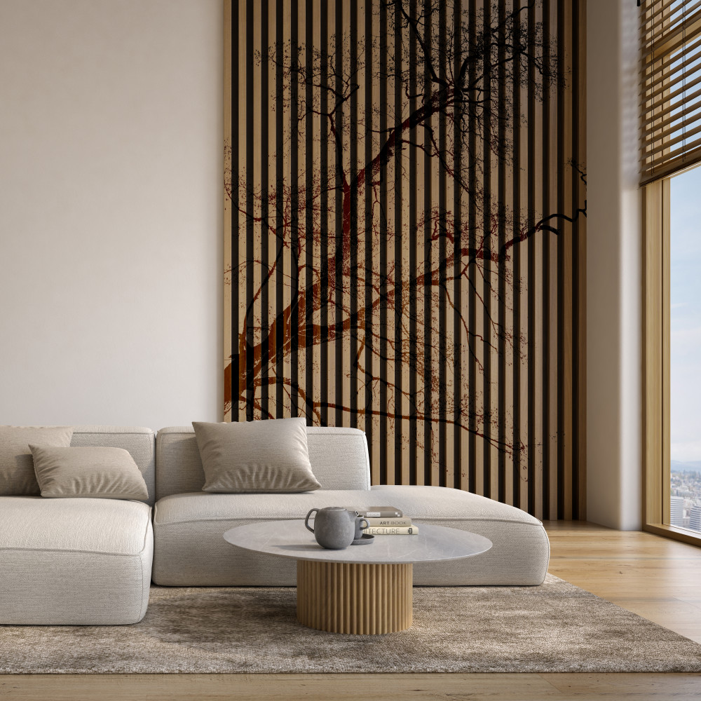 De lyddæmpende vægpaneler reducerer rumklang og efterklang, så du får en roligere og mere behagelig akustik. Samtidig giver printet på træpanelerne dig mulighed for at skabe en personlig og æstetisk vægløsning, hvor kunst og funktion smelter sammen.