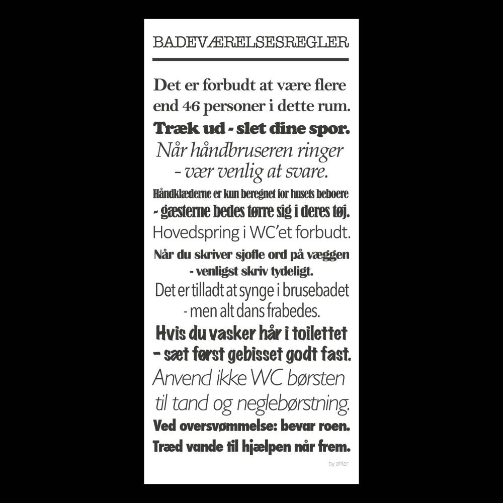 +45 28 600 300Skab personlighed og humor i hjemmet med husregler – et originalt By Ahler Blacksquare-design i tidløs og stilren stil. Skiltet er fremstillet i sort MDF på 18 mm, måler 24x49 cm og passer perfekt i både entre, køkken eller stue.